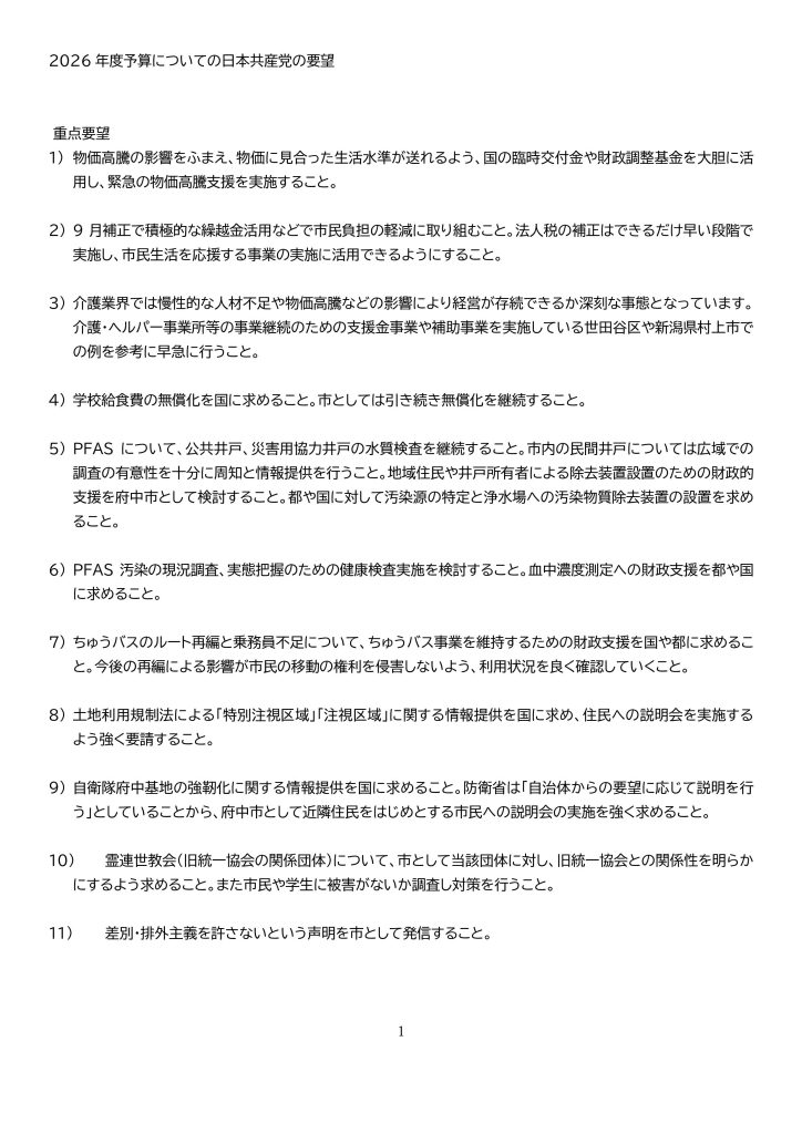 日本共産党府中市議団は、10月31日に2026年度予算要望を市に提出しました。11月19日には高野市長と要望書に基づいた懇談をおこない、要望実現を求めました。